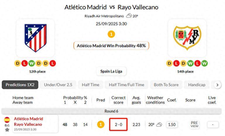 馬德里競技近4輪西甲聯賽進球數不超過2.5球