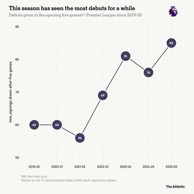 近年英超前5輪首秀球員數量。