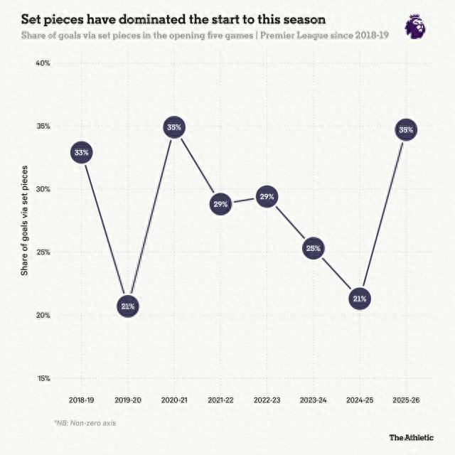 英超開季5輪,權威媒體競技網總結了現階段的一些趨勢和現象。明顯的一條是,本季定位球重要性大幅提升,迄今35%的進球來自定位球(包括點球),而上季同期只有21%。22個角球進球是3年來新高。164個進攻三區界外球直接大力拋進禁區,更是驚人提升:2018-19賽季以來,這是同期這一數值首次達到三位數。