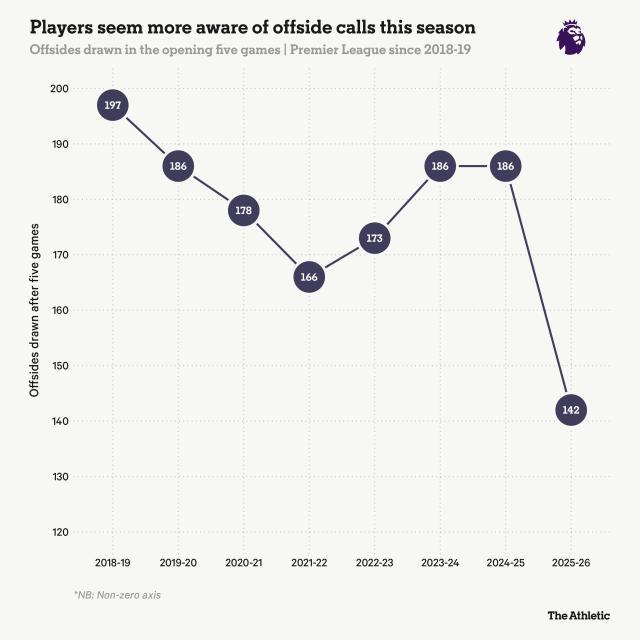 近年英超前5輪越位次數。