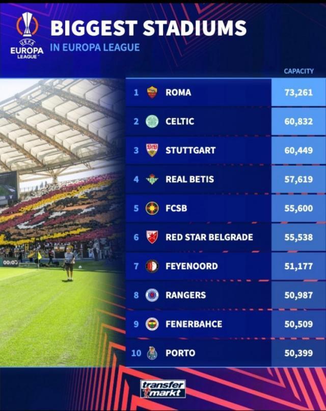 德轉盤點了本賽季歐聯杯參賽球隊主場最大可上座人數榜單,其中羅馬主場居首,具體榜單如下: