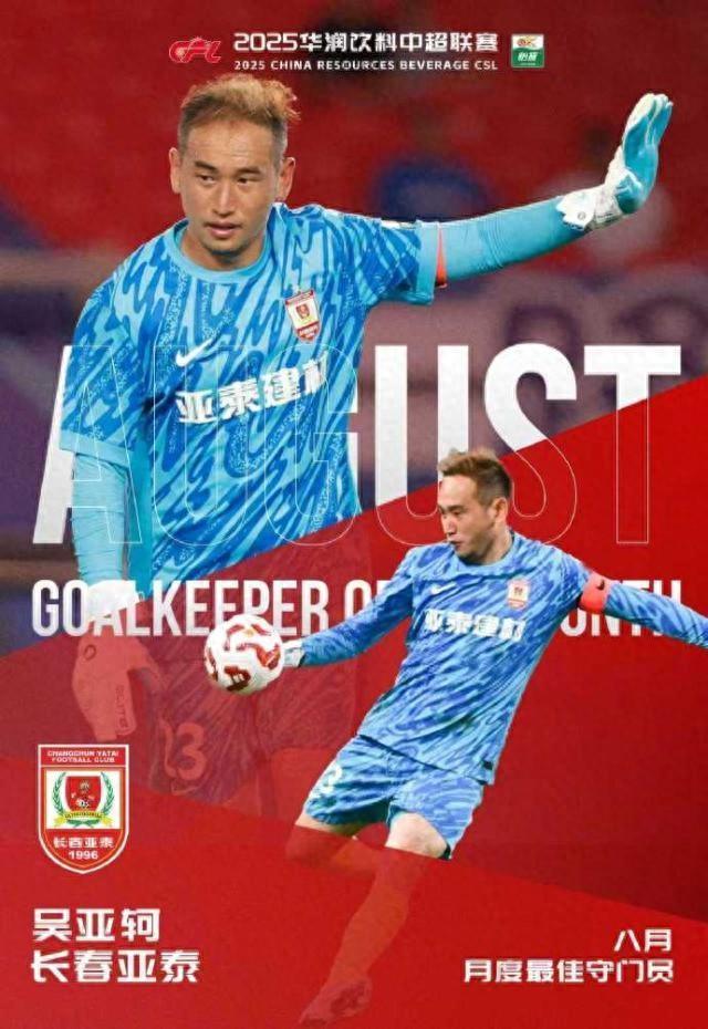 9月25日,中超聯賽官方公佈了8月最佳守門員,來自長春亞泰的吳亞軻當選。