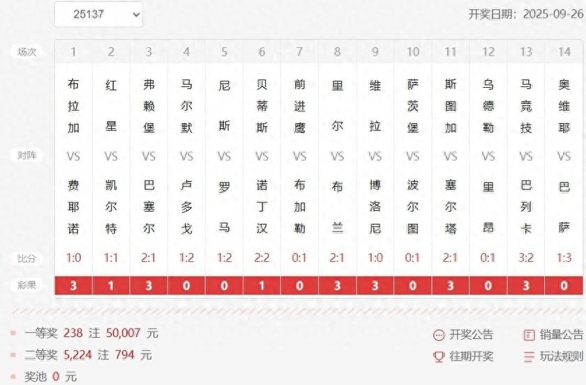 北京時間9月26日,勝負彩第25137期開獎結果揭曉。