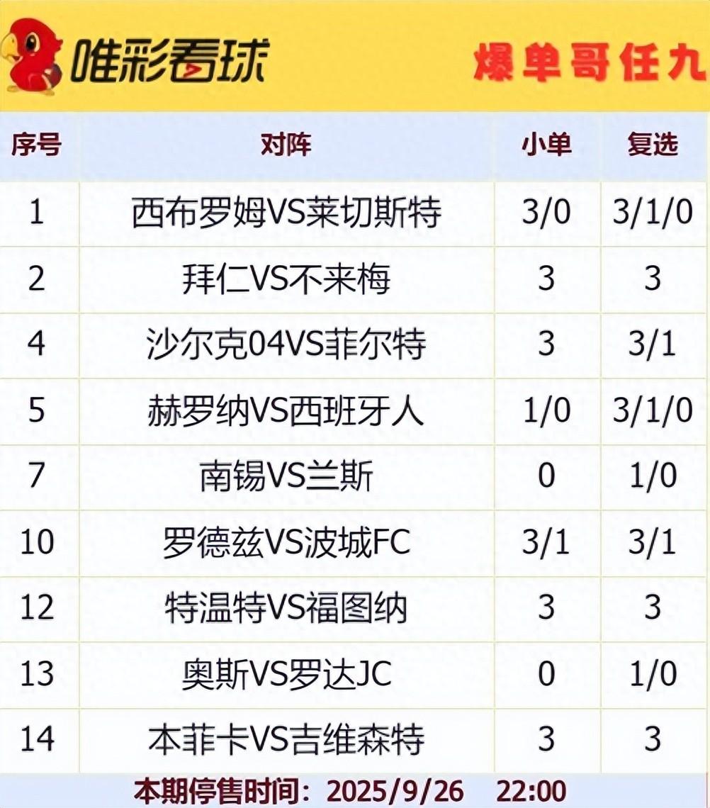 ⚽⚽ 點擊本段文字查看爆單哥精選任九方案,涵蓋多聯賽冷門分析,優化組合策略完整呈現。