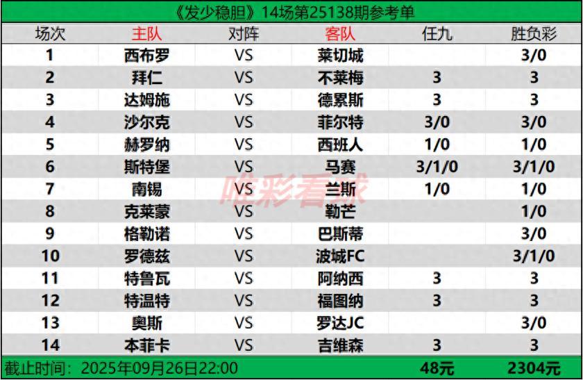 【發少穩膽25138期勝負彩14場(2304元)任九(48元)推薦方案】