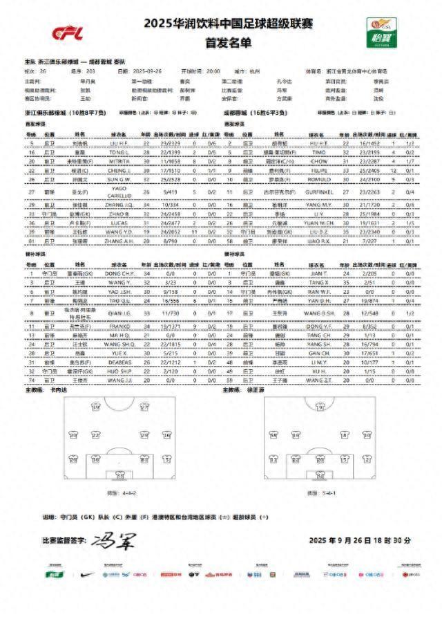 北京時間9月26日,2025賽季中超聯賽第26輪,浙江對陣成都蓉城。賽前,雙方公佈出場陣容,浙江隊三外援出戰,領頭羊成都蓉城則是四外援。