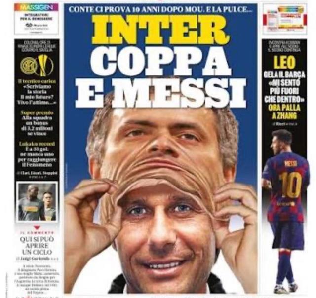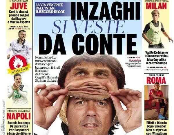 《米蘭體育報》有一個可怕的“傳統”,只要國際米蘭的新舊教頭之間有繼承關係,編輯部就會發力,把“老人”做成一具皮囊,套在現任的頭上。意思都明白,卻總是呈現出一種“畫皮”的恐怖感。穆里尼奧帶着埃雷拉的面具,孔蒂套着穆里尼奧的皮囊,小因扎吉成爲孔蒂的分身,如今終於輪到了齊沃。在9月25日這期的頭版上,小因扎吉也被做成“標本”,被套在了齊沃的頭上。