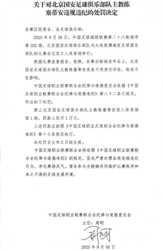 官方:國安主帥塞蒂恩賽後發表不負責任評論,禁賽1場罰款1萬