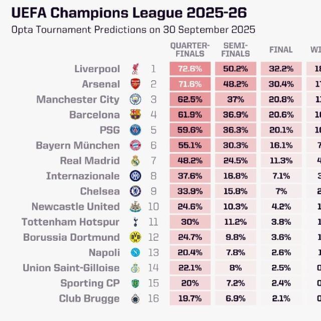 opta最新歐冠奪冠概率:利物浦18%第一,阿森納17%第二,皇馬第七