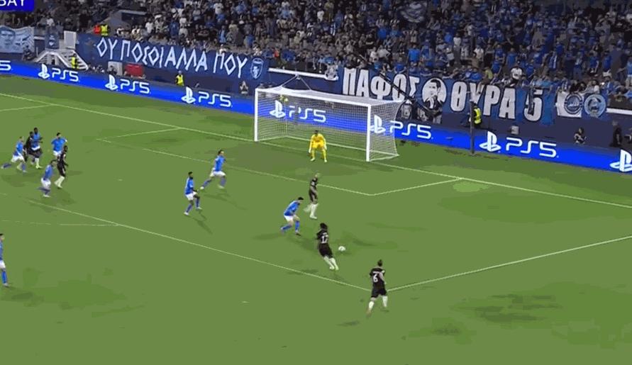 第49分鐘,帕福斯開出角球,戈爾達頭球攻門被門前的隊友擋出。