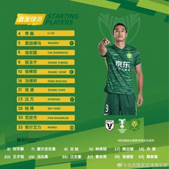 國安首發:33-努爾艾力、4-李磊、5-恩加德烏(F)、16-馮博軒、26-柏楊、30-範雙傑、6-池忠國、10-張稀哲、21-張源、23-達萬(F)、9-張玉寧