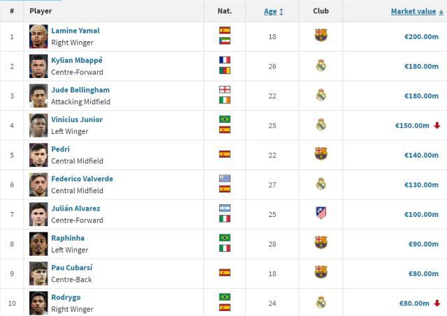 全球球員身價TOP10。這當中西甲佔據6席,此外還有英超的哈蘭德、薩卡和維爾茨,以及德甲的穆西亞拉。