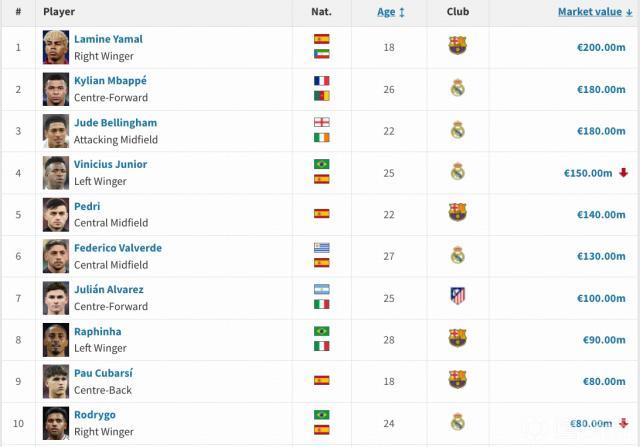 西甲更新身價,姆巴佩1.8億,佩德里1.4億,小蜘蛛1億