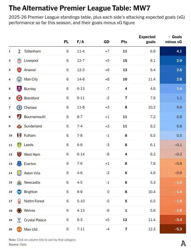 根據The Athletic統計,曼聯預期進球12.3個,實際進球7個,是英超實際進球與預期進球相差最大的球隊。TA報道稱,曼聯本賽季英超場均預期進球數爲2.05個,部分原因是姆伯莫和庫尼亞的加盟,但射門次數(場均15.3次,聯賽最高)也是一個因素。曼聯的射門中很大一部分來自禁區外,這意味着它們會增加累計預期進球數,但通常質量不高。姆伯莫(20球,預期進球12.3個)和庫尼亞(15 球,預期進球8.7個)排在上賽季英超實際進球比預期進球多的球員前三位,但本賽季他們合計只進了一球,預期進球數爲2.8個。再加上B費兩次失點,曼聯目前的處境似乎是因爲在進攻三區缺乏信心。運氣也是一個因素,曼聯四次擊中門框,比其他任何球隊都多。在本賽季英超預期進球值與實際進球值榜單中,熱刺是表現最好的,他們實際進球比預期進球多4.1個,利物浦(2.9個)、阿森納(2.6個)、曼城(2.6個)分居二至四位。