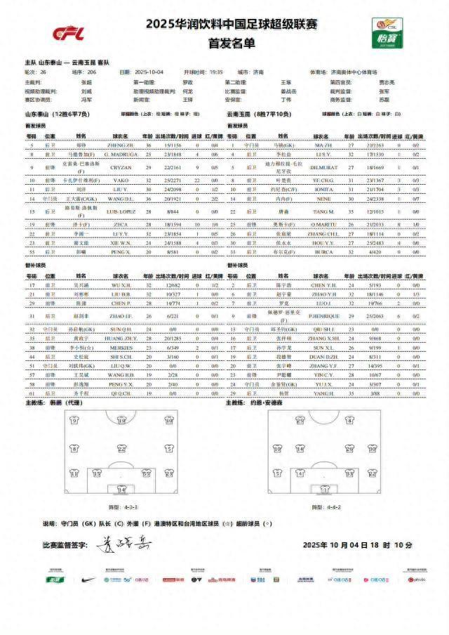 北京時間10月4日19:35,中超第26輪補賽,山東泰山主場對陣雲南玉昆。