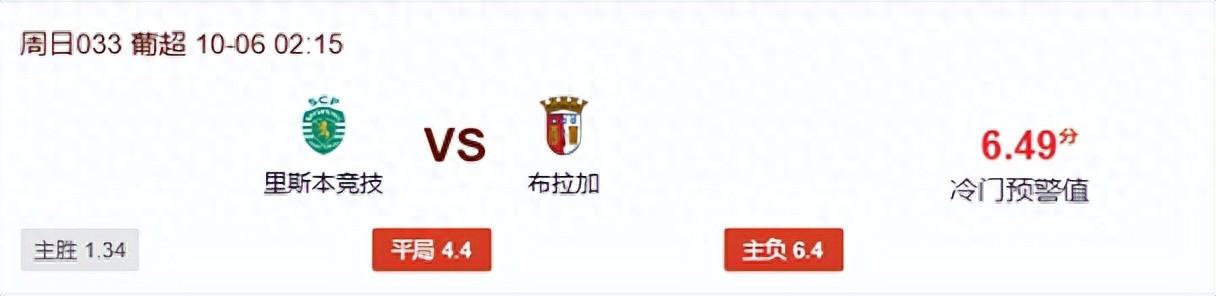 里斯本競技上賽季主場曾被布拉加逼平過,球隊近10次面對對手5勝3平2負,優勢不算明顯。本場比賽里斯本競技主場得到1.0的支持升1.25的支持,結合雙方聯賽的表現來看,有爲主隊造勢之嫌。根據冷門預警模型估算,本場比賽冷門預警值也來到6.49分,此戰里斯本競技主場熱度不低,考慮到布拉加遇強則強的屬性,本場比賽不妨提防布拉加爆冷不敗。