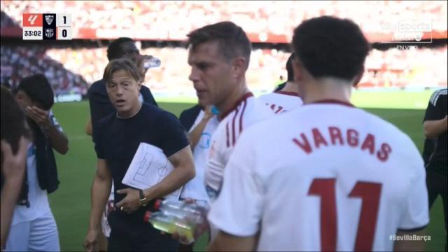 32’利用補水時間,塞維主帥阿爾梅達叮囑隊員:“赫拉德·馬丁身背一黃,我們必須抓住這個機會。激怒他,讓他再喫一黃!”