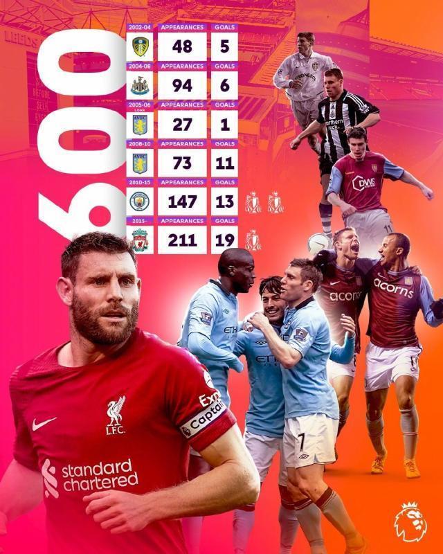 英超第16輪,利物浦3比1南安普敦。比賽第68分鐘,36歲的米爾納替補登場,完成了自己的英超600場里程碑。他也成爲了第四位在英超聯賽中出場達到600+的球員,前三位分別是巴里(653場)、吉格斯(632場)和蘭帕德(609場)。