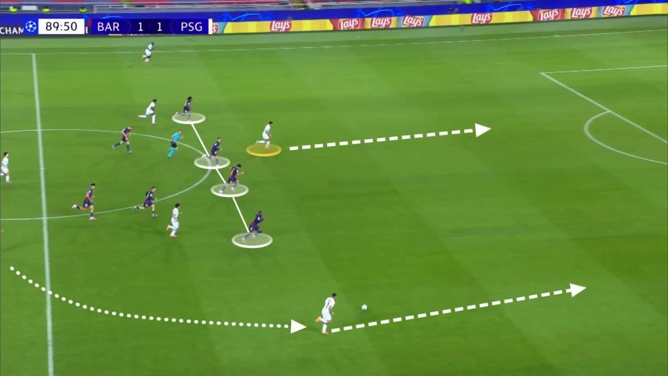 第二步:邊鋒真前插。就在中後衛猶豫的一瞬間,一個速度飛快的邊鋒(比如哈基米或格納布里),從不越位的位置開始往前猛衝。