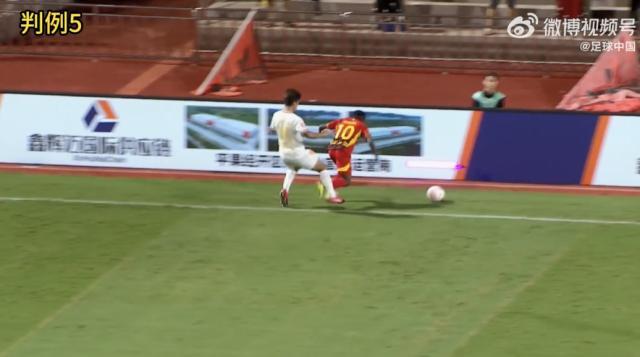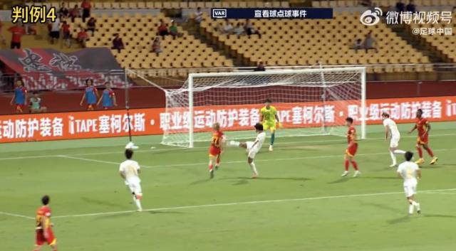 判例一:中超聯賽第23輪,大連英博VS青島西海岸。比賽第61分鐘,青島西海岸5號隊員在本方罰球區內爭搶球時與大連英博2號隊員發生接觸,裁判員判青島西海岸5號犯規並判罰球點球,VAR介入,裁判員經在場回看後,取消了罰球點球的判罰。