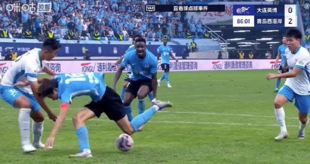 判例二:中超聯賽第23輪,大連英博VS青島西海岸。比賽第86分鐘,大連英博16號隊員在對方罰球區內帶球進攻時與青島西海岸36號隊員發生接觸並倒地。裁判員未判罰犯規,VAR介入,裁判員經在場回看後,維持不犯規的決定。