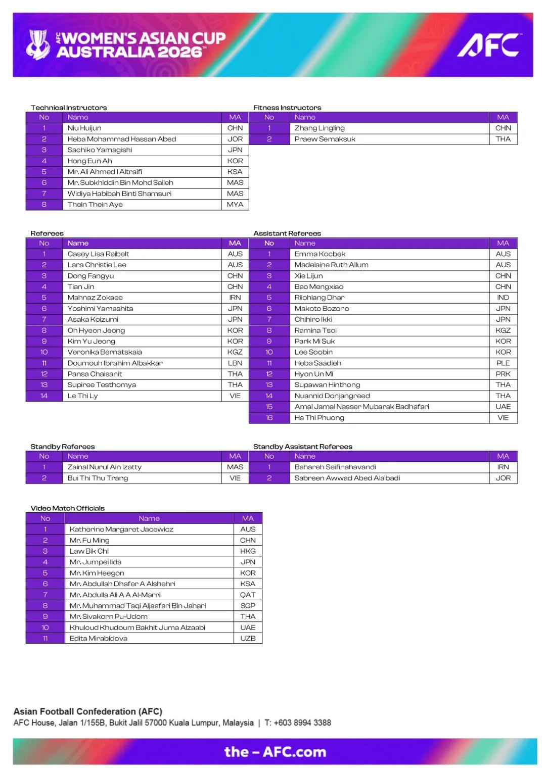 名單中共有45名裁判員,比上屆多了13人,爲歷屆賽事最多,視頻助理裁判(VAR)系統將首次全程啓用,包括小組賽階段,標誌着亞洲女足賽事執裁標準的重要升級。