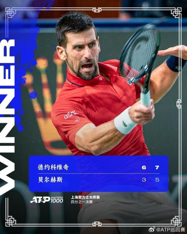 10月09日訊 ATP上海大師賽男單1/4決賽,38歲的德約科維奇對陣世界排名第44位的貝爾赫斯,最終德約以6-3、7-5擊敗對手,第10次打進賽會四強、第80次闖進大師賽男單四強。半決賽德約的對手將是資格賽黑馬瓦舍羅。
