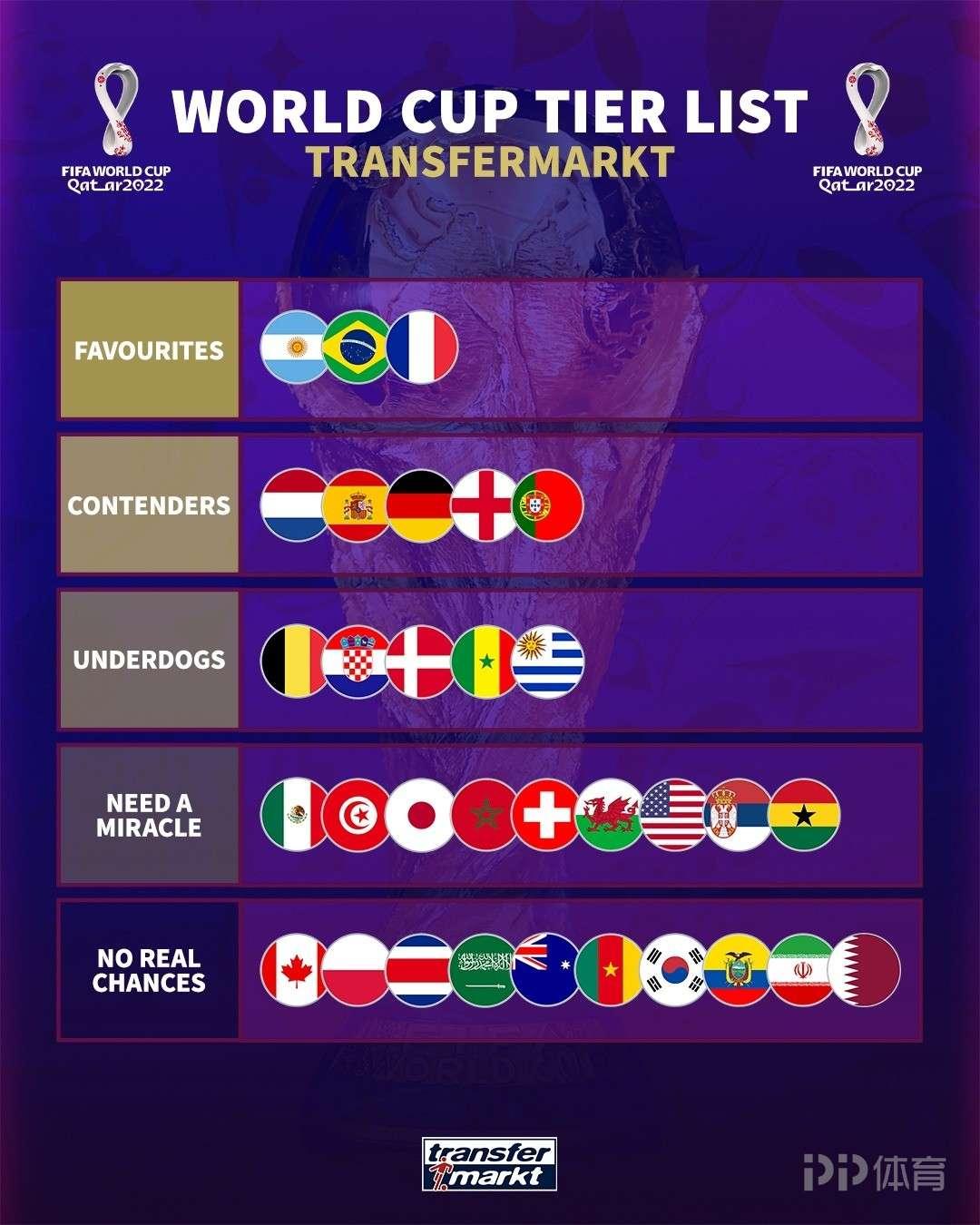 卡塔爾世界盃還有不到一週的時間就將開幕,球隊摩拳擦掌,球迷更是翹首以盼。誰是本屆盃賽最有力的競爭者、誰最有冠軍相早已成爲熱議。近日,德國轉會市場預測了本屆世界盃的奪冠熱門球隊,其中阿根廷、巴西、法國爲第一檔,第二檔位有葡萄牙、英格蘭等豪門球隊。