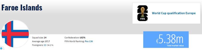 法羅羣島全隊身價僅爲538萬歐元