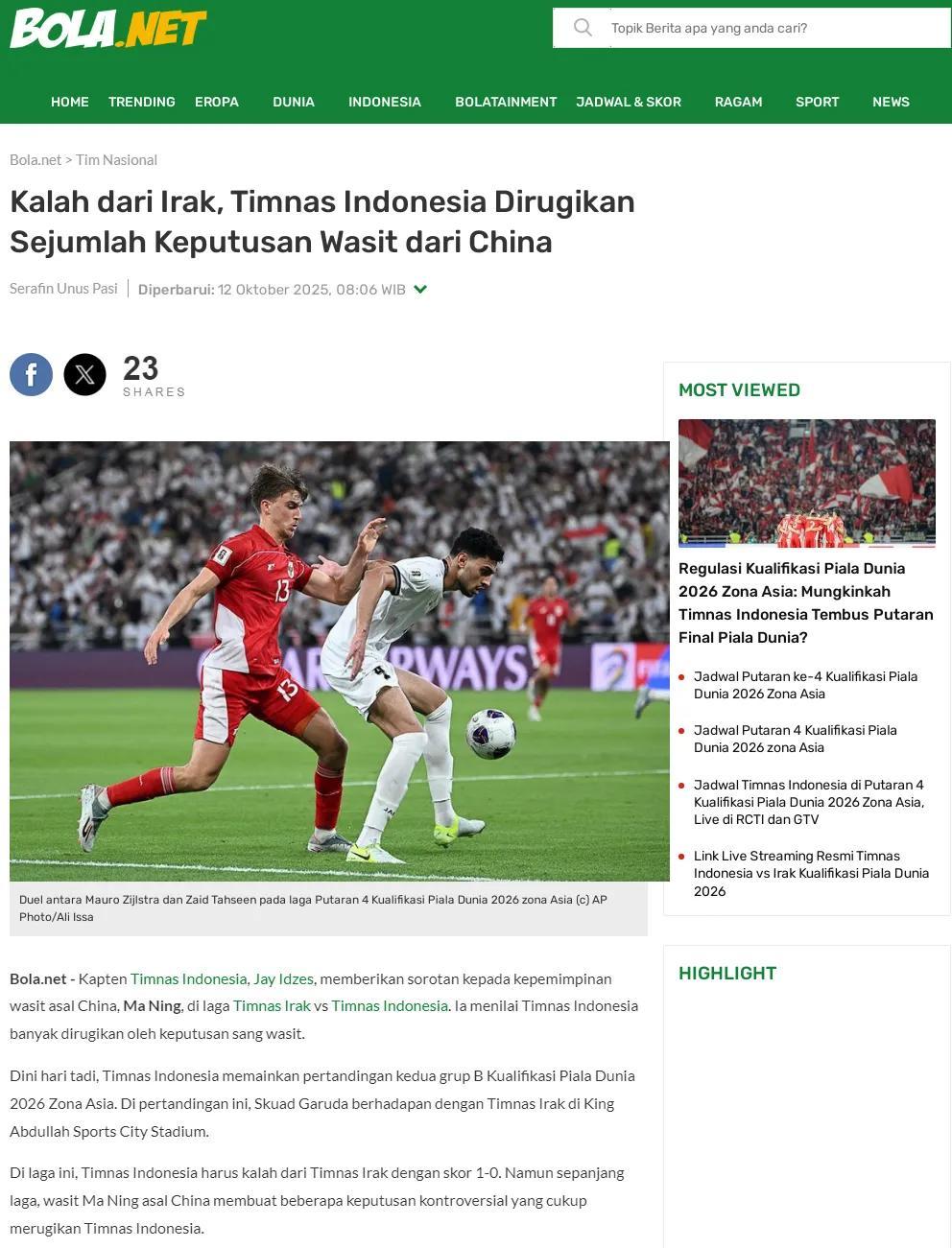 賽後印尼媒體BOLA撰文稱“印尼國家隊因中國裁判的決定蒙受損失”,文中指出“來自中國的裁判馬寧做出了幾項具有爭議性的判罰,對印尼國家隊造成了相當大的不利影響。”印尼隊長伊澤斯賽後接受採訪時也表示:“我們試圖尊重裁判,儘管他們做出的判罰對我們不利,但我們仍然必須尊重他們。”