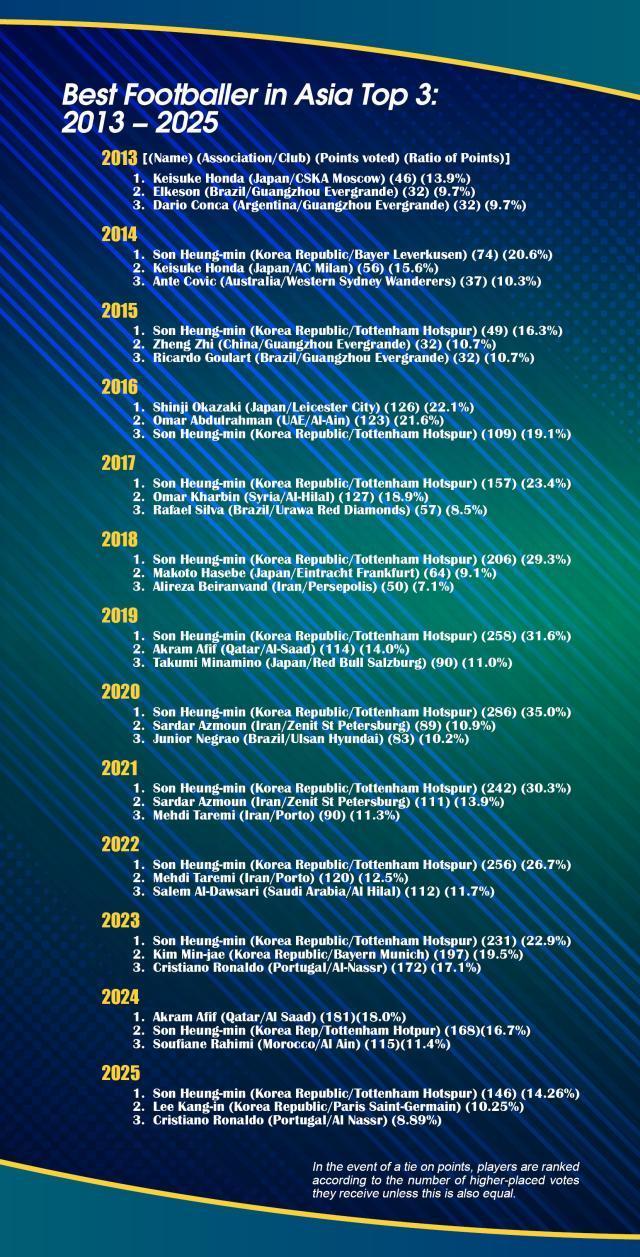 縱觀亞洲金球獎創辦歷史以來,自2014年第二屆孫興慜首次獲獎以來,到2025年總12屆,其中只有日本球員岡崎慎司在2016年(總第四屆)和卡塔爾球員阿菲夫在2024年(總第十二屆)獲得過亞洲金球獎獎項。其餘10屆都由孫興慜包攬,而在2016年和2024年,孫興慜分居第三和第二。