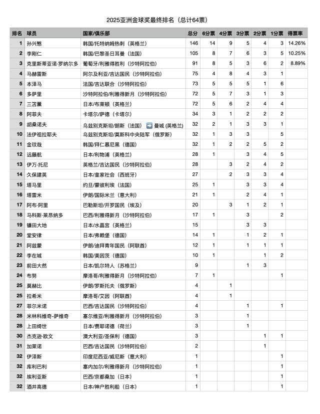這樣相對於往年,俱樂部賽事可能在2025年亞洲金球獎賽事中比重更大。32歲的孫興慜以較大的優勢(領先第二名近40分)重奪冠軍。