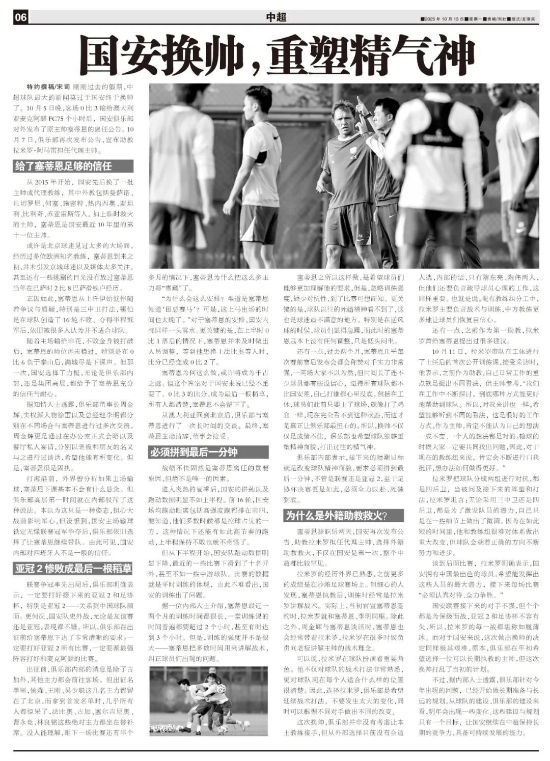 還有一點,過去兩個月,塞蒂恩幾乎每次賽前賽後發佈會都會稱讚對手實力非常強,一兩場大家不以爲然,但時間長了連不少球員都有些沒信心,覺得所有球隊都不比國安差,自己打誰都心裏沒底。包括在工體,球員們此前只要上了球場,就像打了雞血一樣,現在完全看不到這種狀態,而這纔是真正讓俱樂部最擔心的。所以,換帥不僅僅是成績不佳,俱樂部也希望球隊能夠重塑精神面貌,打出過往的精氣神。