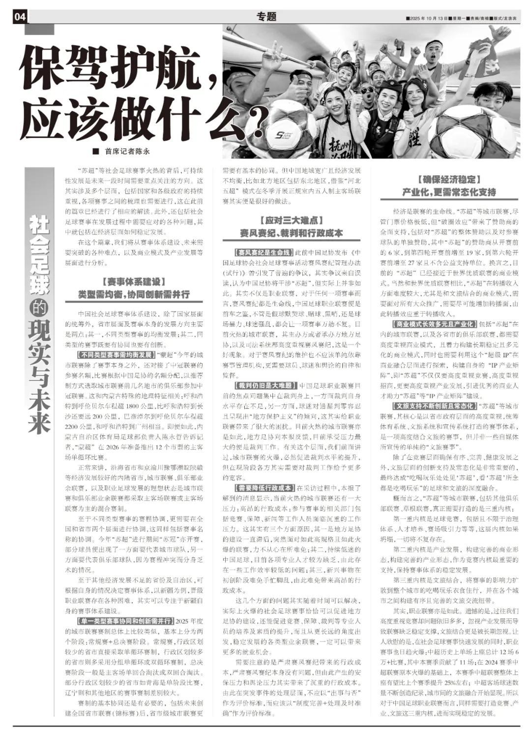 首席記者陳永報道 “蘇超”等社會足球賽事火熱的背後,可持續性發展是未來一段時間需要重點關注的方向。這其實涉及多個層面,包括國家和各級政府的持續重視,各項賽事之間的梳理也需要進行,這在此前的篇章已經進行了相應的解讀。此外,還包括社會足球賽事在發展過程中需要應對的各種問題,其中就包括在經濟層面如何穩定發展。