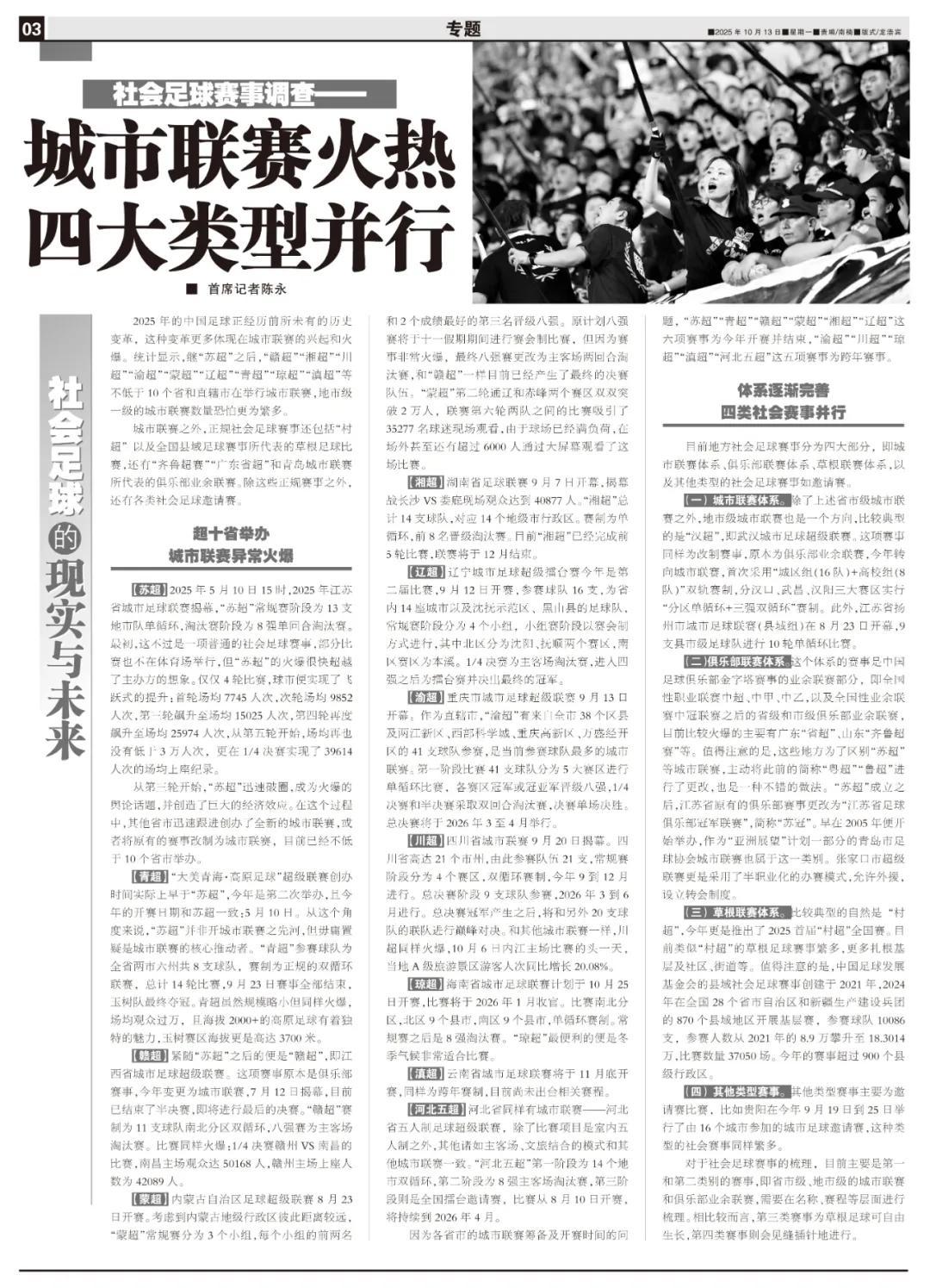 首席記者陳永報道 2025年的中國足球正經歷前所未有的歷史變革,這種變革更多體現在城市聯賽的興起和火爆。統計顯示,繼“蘇超”之後,“贛超”“湘超”“川超”“渝超”“蒙超”“遼超”“青超”“瓊超”“滇超”等不低於10個省和直轄市在舉行城市聯賽,地市級一級的城市聯賽數量恐怕更爲繁多。
