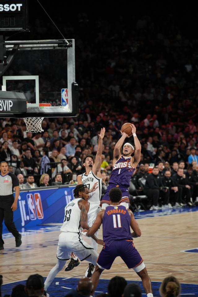 兩隊的比賽依然打得激烈,上一場籃網前10投全中幫助球隊早早領先,今天則是布克首節獨得11分率領太陽建立優勢。小波特的頂人幹拔總是能引起歡呼,理查茲的大力重扣也被大屏幕反覆回放,球迷們看得也算過癮。太陽在最多領先15分的情況下,半場被籃網追到了51比49,只領先2分。和上一場不同的是,這一次曾凡博沒能在半場結束前登場。