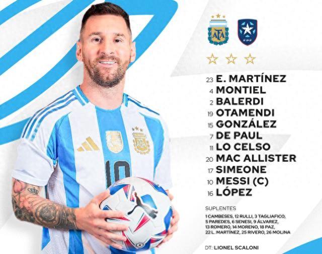 阿根廷陣容(442):埃米利亞諾·馬丁內斯(76’坎貝塞斯)/蒙鐵爾(63’莫利納)、巴萊爾迪、奧塔門迪(46’勞塔羅·裏韋羅)、尼古拉斯·岡薩雷斯/朱利亞諾·西蒙尼(58’帕斯)、德保羅、洛塞爾索(46’阿尼瓦爾·莫雷諾)、麥卡利斯特/梅西、何塞·洛佩斯(63’勞塔羅·馬丁內斯)