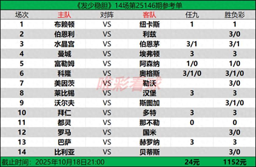 【發少穩膽25146期勝負彩14場(1152元)任九(24元)推薦方案】