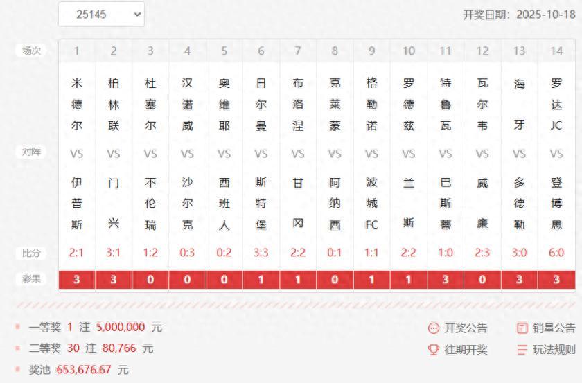 北京時間10月18日,勝負彩第25145期開獎。本期一等獎僅1注,獎金高達5,000,000元;二等獎30注,單注獎金80,766元。任九玩法開出370注,每注獎金26,224元。本期足彩總銷售額爲12,619,814元,任九投注總額達15,161,216元。
