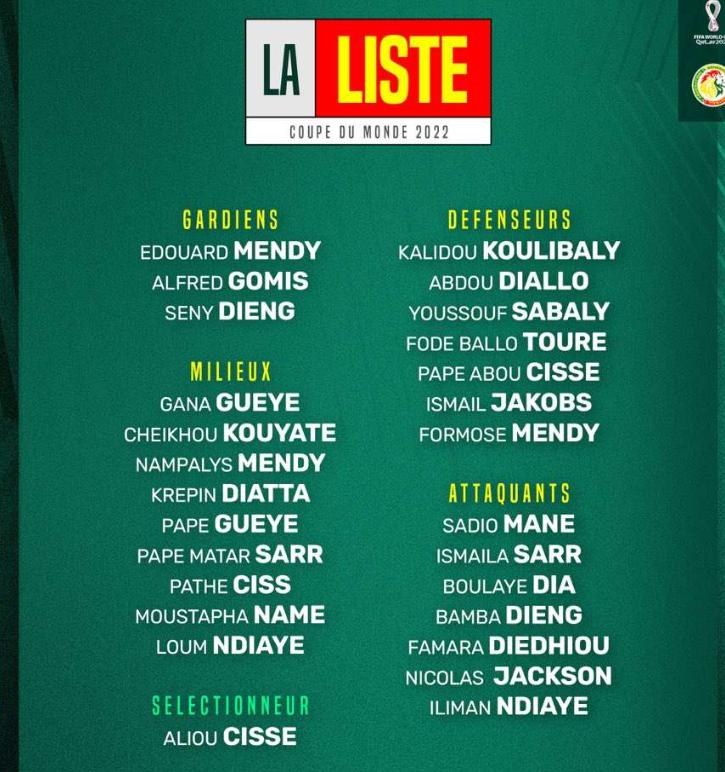 前鋒:馬內(拜仁)、伊斯梅拉-薩爾(沃特福德)、尼古拉斯-傑克遜(比利亞雷亞爾)、迪亞(薩勒尼塔納)、班巴-迪昂(馬賽)、迪德希歐(阿蘭亞斯堡)、伊利曼-恩迪亞耶(謝菲爾德聯)