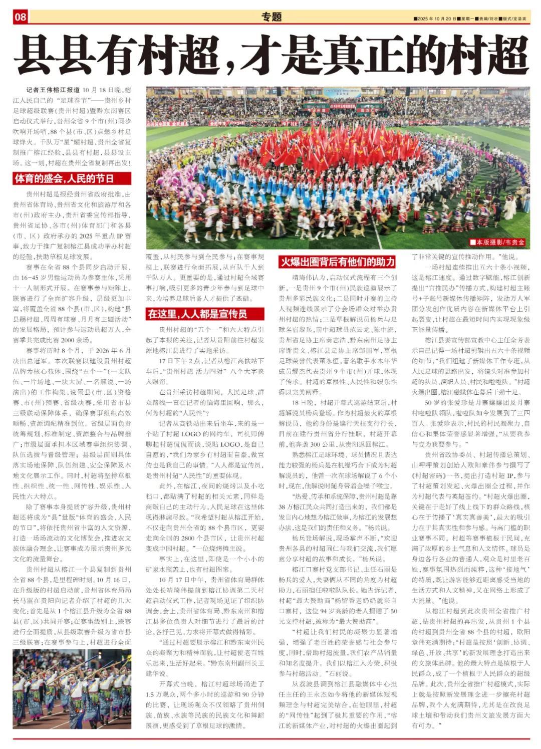 從榕江村超到此次貴州全省推廣村超,是貴州村超的再出發,從貴州1個縣的村超到貴州全省88個縣的村超,歐陽章偉充滿期待:“村超是按照‘創新、協調、綠色、開放、共享’的新發展理念打造出來的文旅體品牌。他的最大特點是植根於人民羣衆,成了一個植根於人民羣衆的超級品牌。此次,貴州全省推廣村超模式,實際上就是按照新發展理念進一步擦亮村超品牌,我個人充滿期待,尤其是在改良足球土壤和帶動我們貴州文旅發展方面大有可爲。”