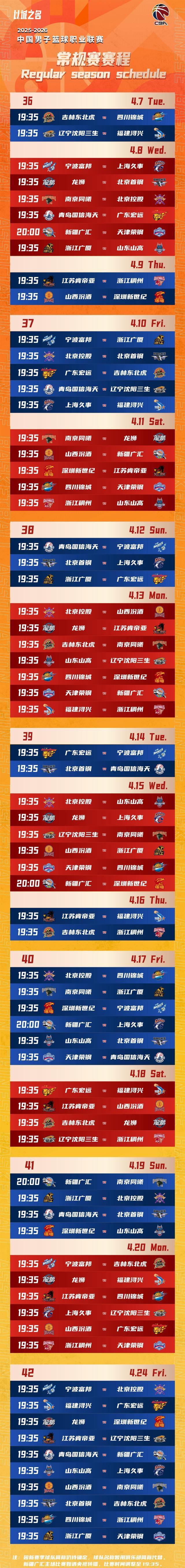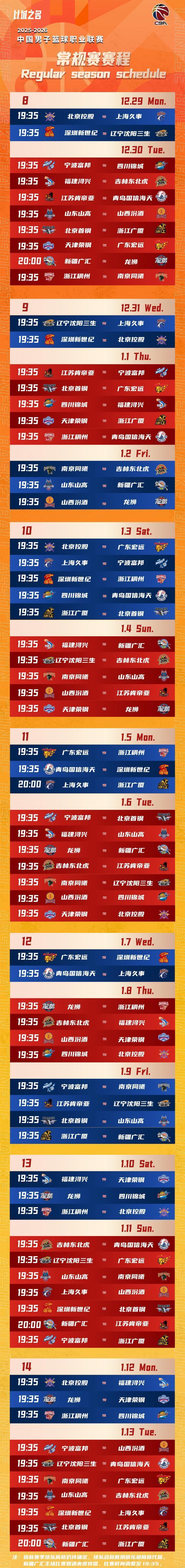 北京時間10月20日,CBA官方公佈2025-2026賽季CBA聯賽常規賽將於12月12日開賽,次年4月24日收官,具體賽程公佈如下。(注:由於目前新賽季球隊全簡稱尚未確定,對陣表中球隊名稱暫用俱樂部簡稱代替。)