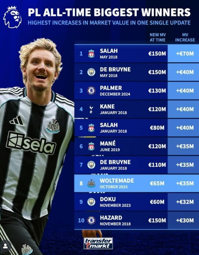 英超歷史單次身價漲幅榜:薩拉赫+7000萬歐居首,沃爾特馬德在列