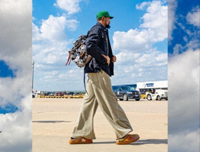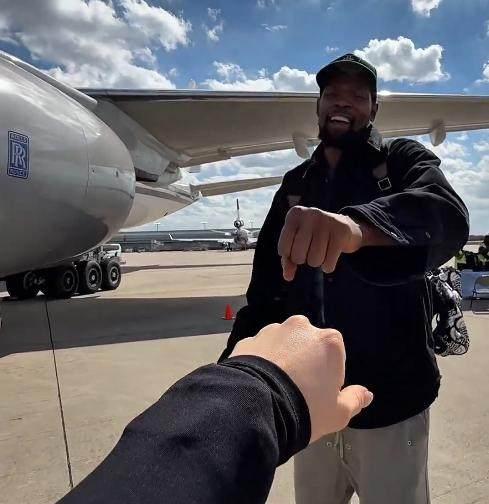 杜蘭特神態輕鬆,他背了一個揹包。“書包杜”的傳統得到了延續。杜蘭特戴了一頂綠色的帽子,在登機前,他一臉笑容地和拍攝視頻的火箭工作人員碰拳打招呼。