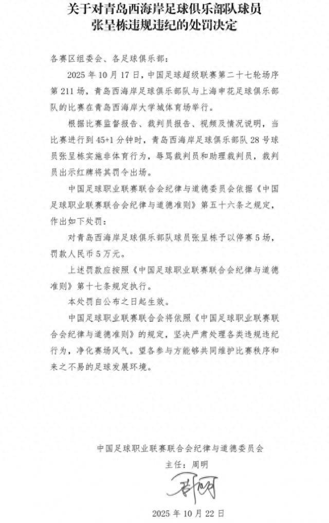 對青島西海岸足球俱樂部隊球員張呈棟予以停賽5場,罰款人民幣5萬元。