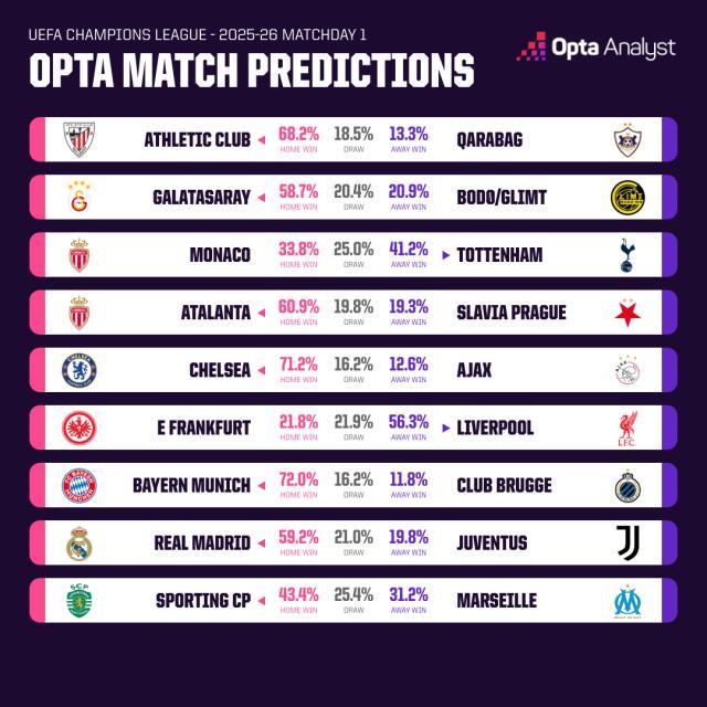 相較於皇馬的獲勝概率,英超衛冕冠軍利物浦得到的推算結果則爲56.3%,要稍低一些,但考慮到紅軍是客場作戰,這其實已經說明超算非常看好斯洛特的球隊能夠擊敗法蘭克福。在此之前,利物浦已經連續輸給水晶宮、加拉塔薩雷、切爾西和曼聯,遭遇自2014年11月以來的最長連敗,若是再敗,那就將是該隊自1953年以來的最差表現。