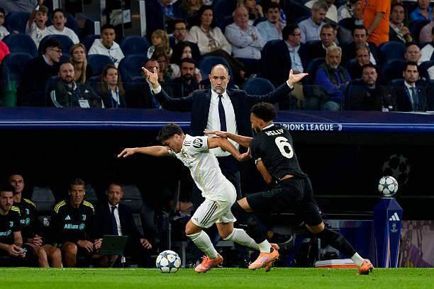 尤文圖斯表面上仍然是慣用的3421陣型,但具體站位更像是一個5311,耶爾德茲充當前場自由人,壓縮後場空間讓皇馬打不進來,並利用快速轉移形成反擊。事實證明,尤文這些球員不是踢不好球,只是無法在多線作戰中維持高強度高效率。對陣皇馬是近一個月以來,球員們最有鬥志最專注的比賽,開場僅7分鐘,球隊就打出了一波流暢配合。從凱利在邊路受到干擾解圍開始,皮球經過了坎比亞索、耶爾德茲、赫夫朗·圖拉姆後,巴爾韋德略有干擾,沒有阻止皮球來到弗拉霍維奇的腳下,他也不停球敲給已經突圍的坎比亞索,接着是分給右路一片開闊地的卡盧盧,只可惜法國邊翼衛傳中缺乏變化,沒能看到後點包抄的兩個隊友。