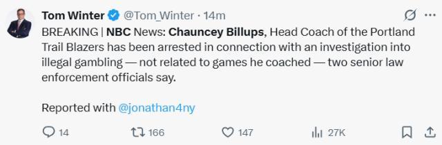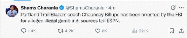 就在人們紛紛展望楊瀚森和開拓者的新賽季之旅時,波特蘭方面卻傳來一則令人震驚的消息。根據查拉涅的報道,開拓者主教練比盧普斯因爲涉嫌參與非法賭博,被FBI逮捕。據NBC率先報道,多位美國籃球圈內的名記也相繼證實。