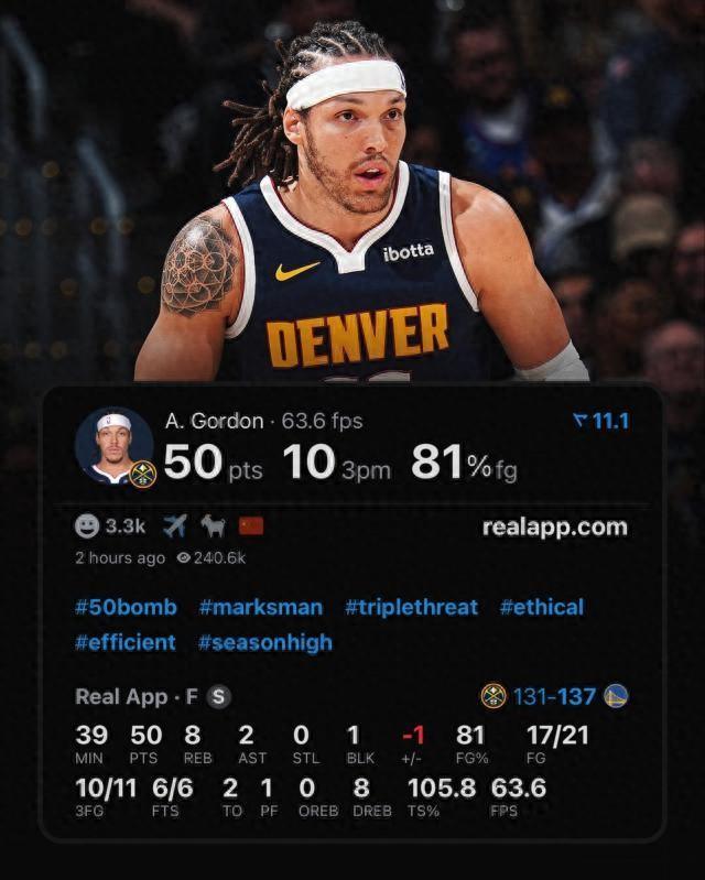 北京時間10月24日,掘金迎來賽季揭幕戰,他們客場挑戰金州勇士。經歷了一個加時賽的苦戰,戈登拿到了創職業生涯紀錄的50分(此前最高41分),他在三分線外的準星令人驚歎,上半場就7投7中,追平了NBA歷史半場三分全中的命中紀錄。最終全場打完,戈登的真實命中率爲105.8%,超越凱瑞·歐文,成爲了NBA歷史單場真實命中率最高的50分先生。