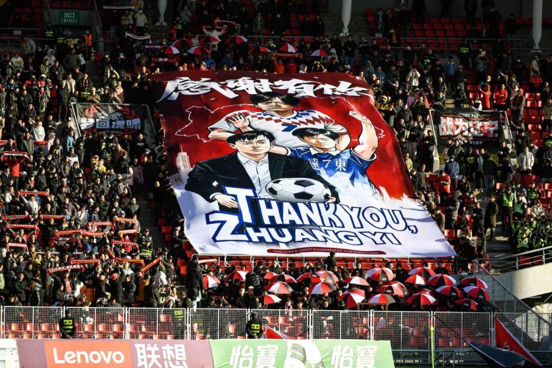 成功奪冠、衝超之後,鐵西體育場變成了歡樂的海洋。現場大屏幕打出“長風破浪會有時,中超我們來了”,球迷們打出“中超我們回來了”“我們是冠軍”的巨幅標語。還有的球迷展示印有“感謝莊毅”的巨幅旗幟,感謝遼寧鐵人俱樂部投資人莊毅爲遼瀋足球做出的巨大貢獻。